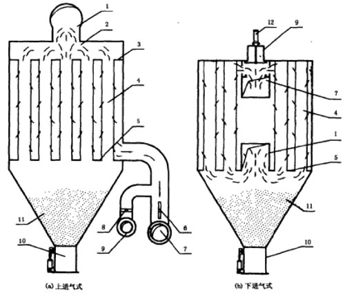 其它型號(hào)烘干機(jī)袋式除塵器,采用的是上部進(jìn)氣方式,即煙塵均在濾袋內(nèi)自上而下通過,該形式需要上、下兩層花孔板,并設(shè)計(jì)有用于氣流重新分配的進(jìn)氣室,如圖所示。