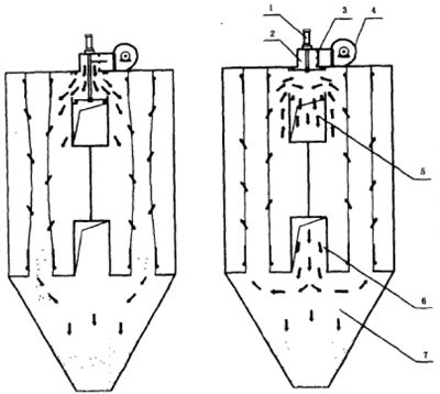 其它型號(hào)烘干機(jī)袋式除塵器采用上部進(jìn)氣方式,如圖所示,粉塵均由濾袋內(nèi)部自上而下通過,然后落入灰斗。粉塵對(duì)濾袋的磨損較為嚴(yán)重。