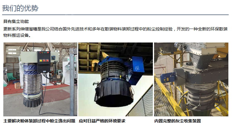 服務電話:13091153069(同微信)伸縮式卸料管是一種物料處理設備,用于將粉末和干散狀物料無塵地裝入或卸入容器、卡車和船只。它是一種自動化且靈活的解決方案,可以根據(jù)不同行業(yè)的需求進行定制。伸縮式卸料管系統(tǒng)的主要功能是通過垂直的鐵管利用物料自身的重量排放粉末或顆粒狀散裝固體,同時通過外層的一層帆布材料的布筒收集卸料時產(chǎn)生的粉塵。為了適應上部排放點和下部裝載點之間的不同高度,鐵管被設計為可伸縮的。鐵管的靈活性是伸縮式卸料管系統(tǒng)的關鍵特性,它允許根據(jù)不同的排放和裝載點進行調整,使其成為廣泛應用的多功能解決方案。
