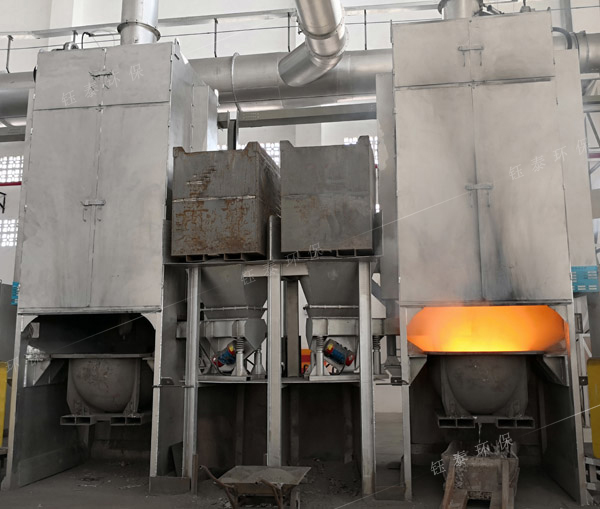 將熔煉爐中鋁灰扒出,盛入鋁灰機(jī)專(zhuān)用的鍋中,通過(guò)設(shè)備攪拌,將比重不同的金屬鋁和熱殘灰分離。在對(duì)高溫鋁灰進(jìn)行攪拌的這個(gè)過(guò)程是粉塵最為嚴(yán)重的時(shí)候,此時(shí)炒灰機(jī)配套的55KW除塵器需要滿(mǎn)負(fù)